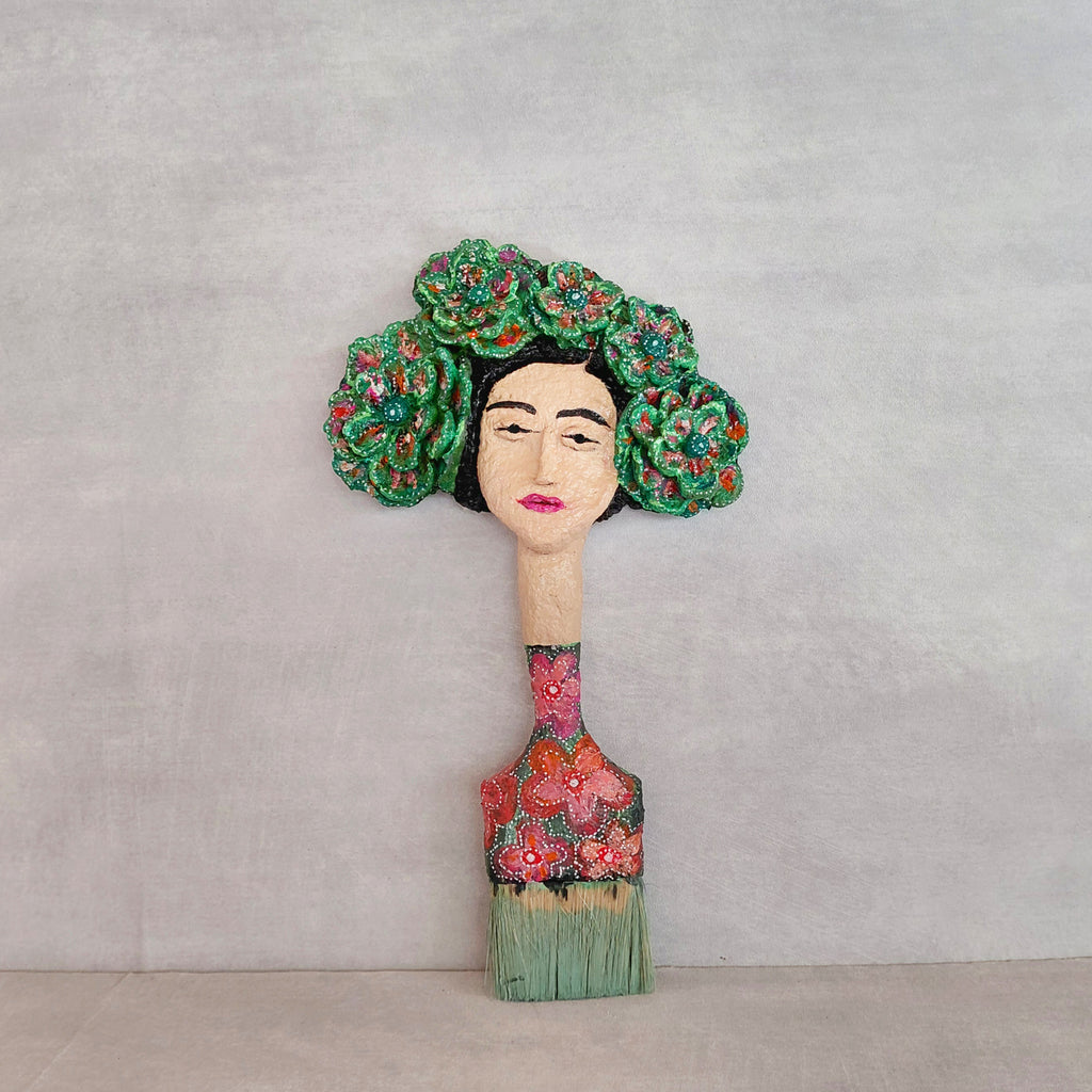 - הפסל מפוסל בעיסת נייר על מברשת צבע ישנה שיצאה מכלל שימוש וצבוע בצבעי אקריליק.