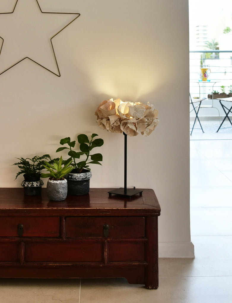 • האהיל עשוי מנייר אפיה, דפי ספר ישנים ודבקים שונים.