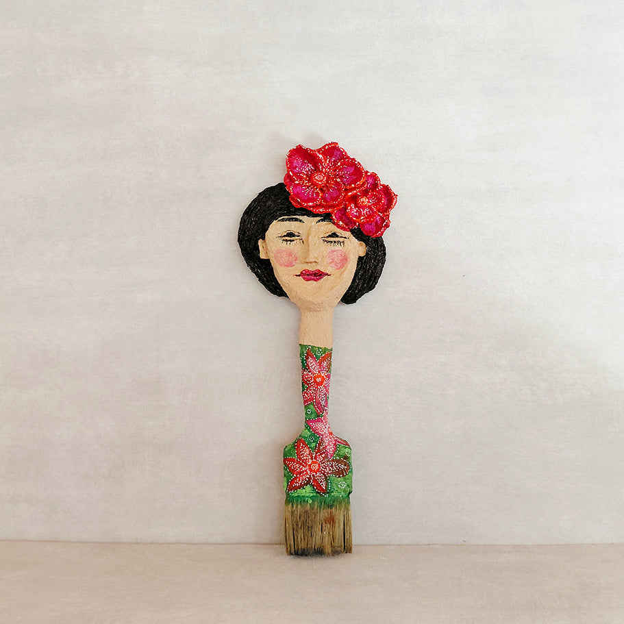• הפסל מפוסל בעיסת נייר על מברשת  ישנה שיצאה מכלל שימוש וצבוע בצבעי אקריליק.