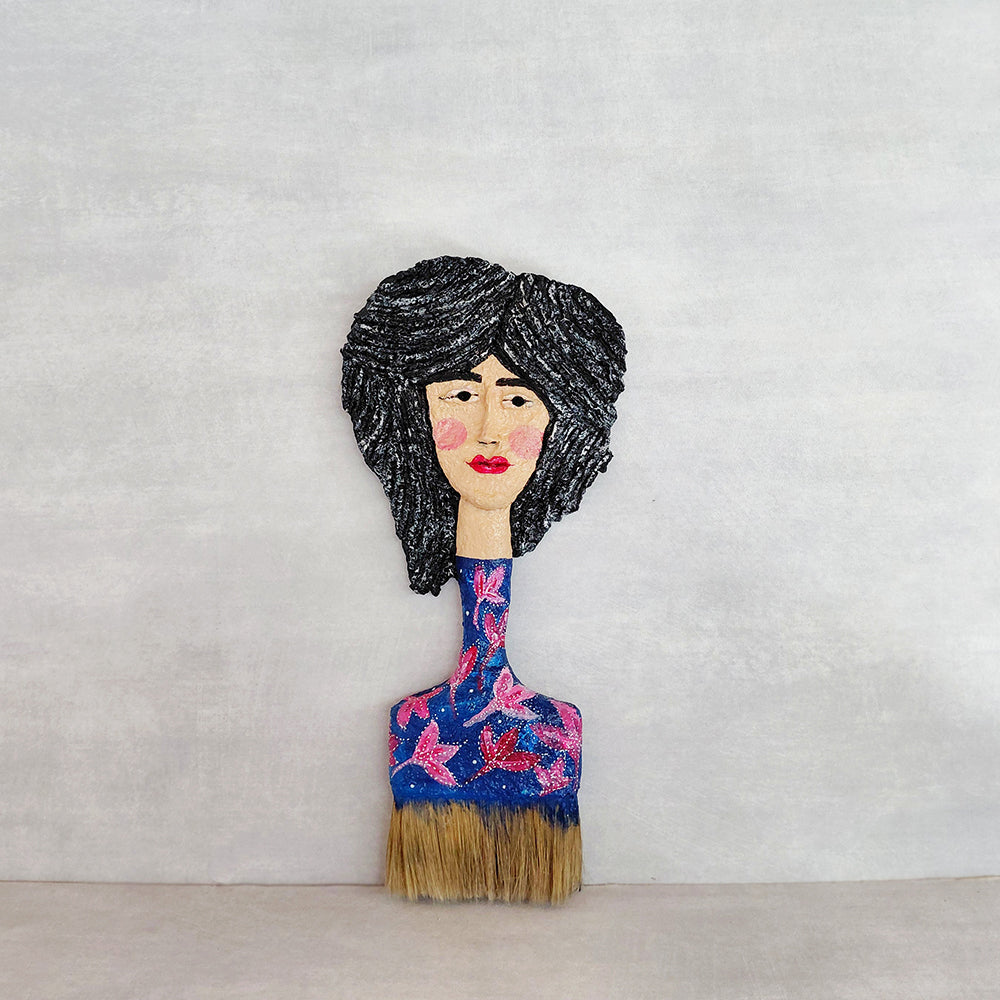 - הפסל מפוסל בעיסת נייר על מברשת צבע ישנה שיצאה מכלל שימוש וצבוע בצבעי אקריליק.
